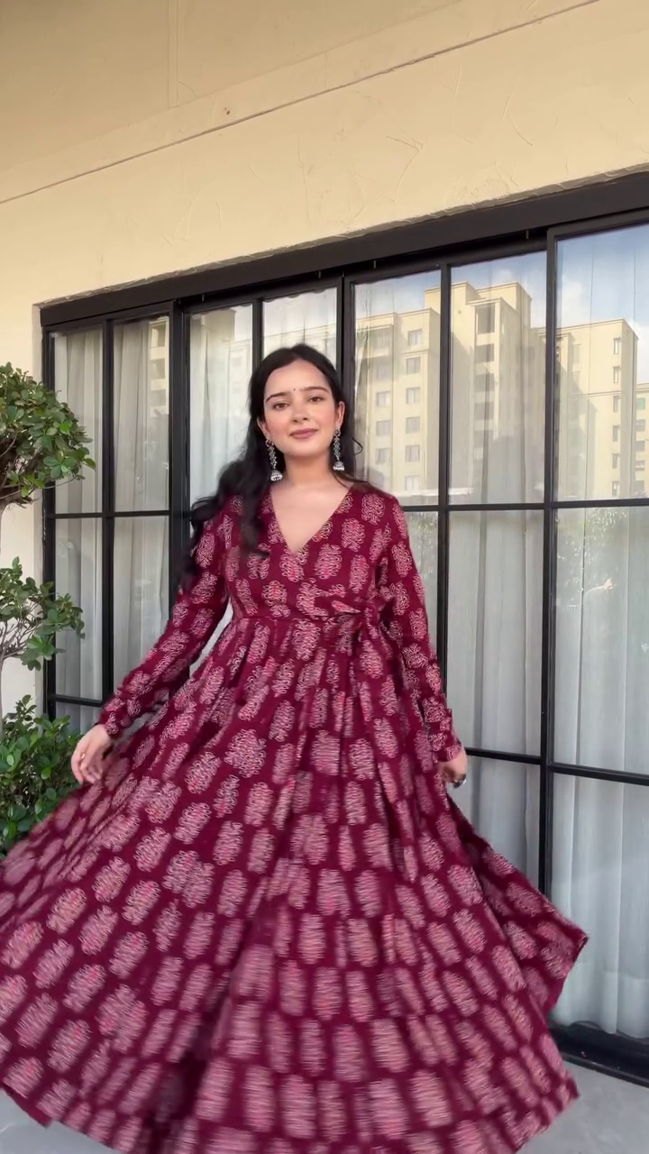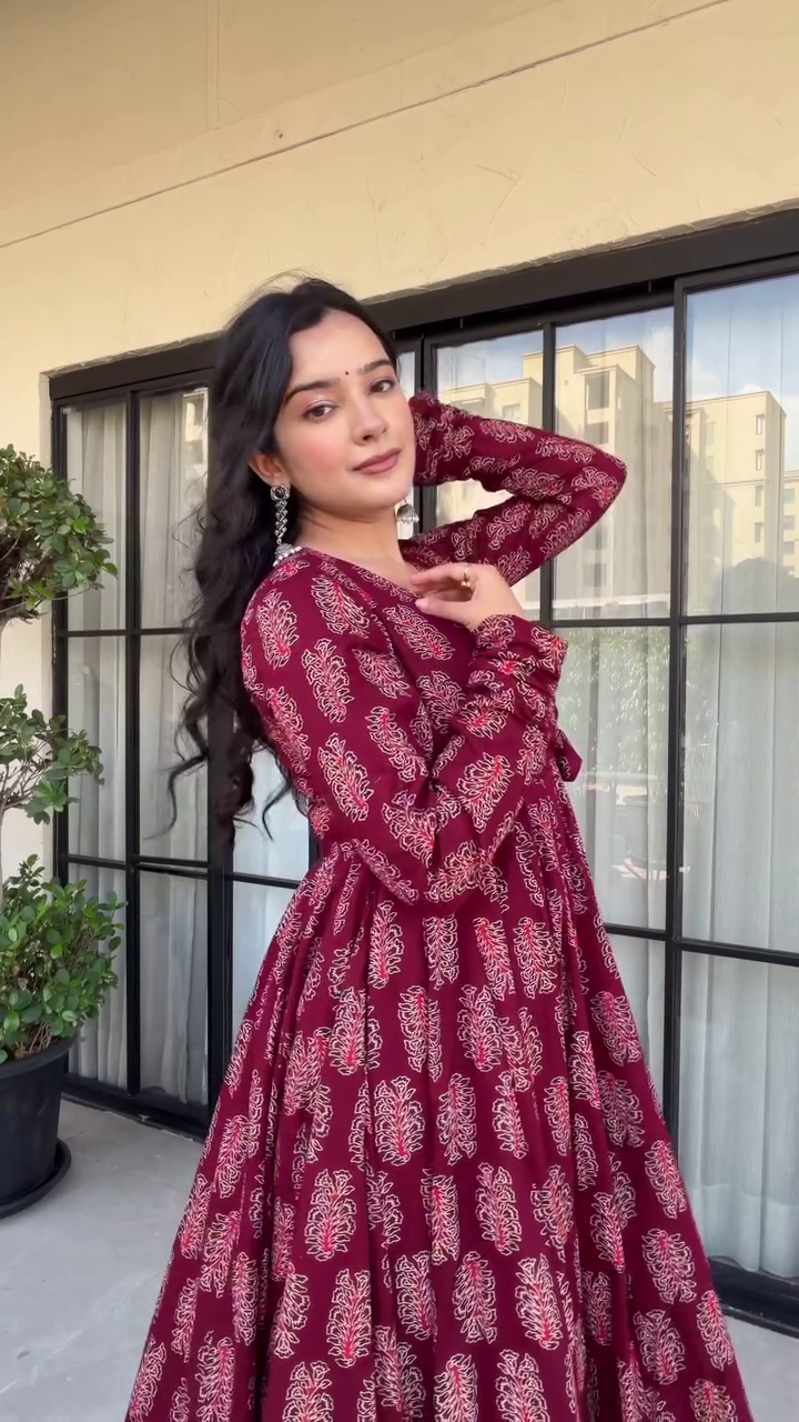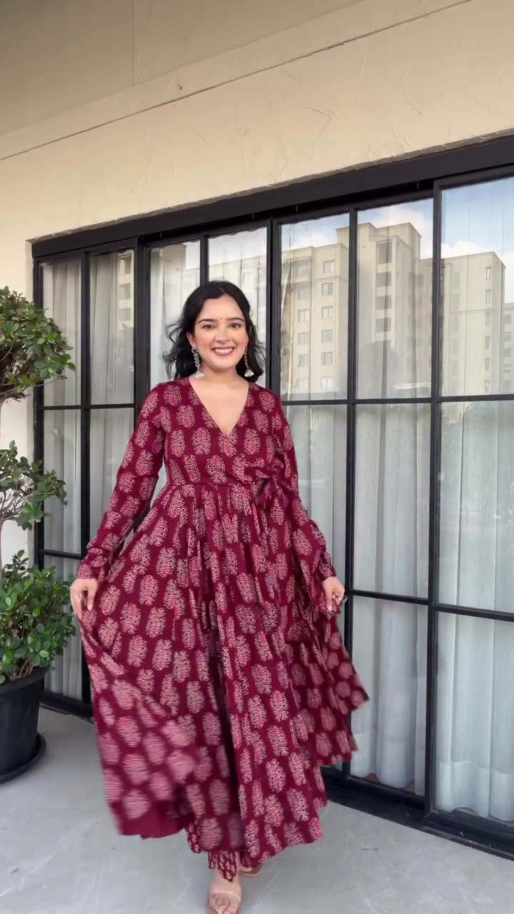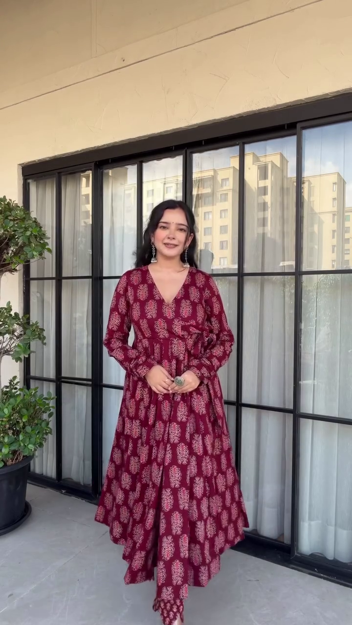 Step into effortless elegance with our Maroon Angrakha-Style Anarkali Kurti Set, crafted to make you stand out in every festive and casual occasion. Designed with soft, breathable premium printed cotton, this outfit blends traditional charm with modern comfort — perfect for all-day wear! ❤️