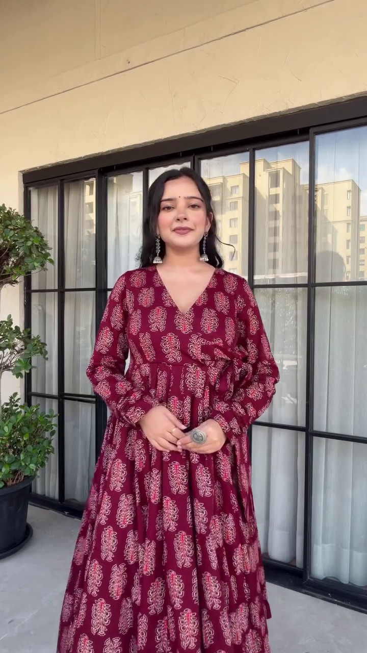 + Free Shipping✨ Elegant Maroon Angrakha Kurti Set – Premium Printed Cotton | Sizes XS-XXL ✨