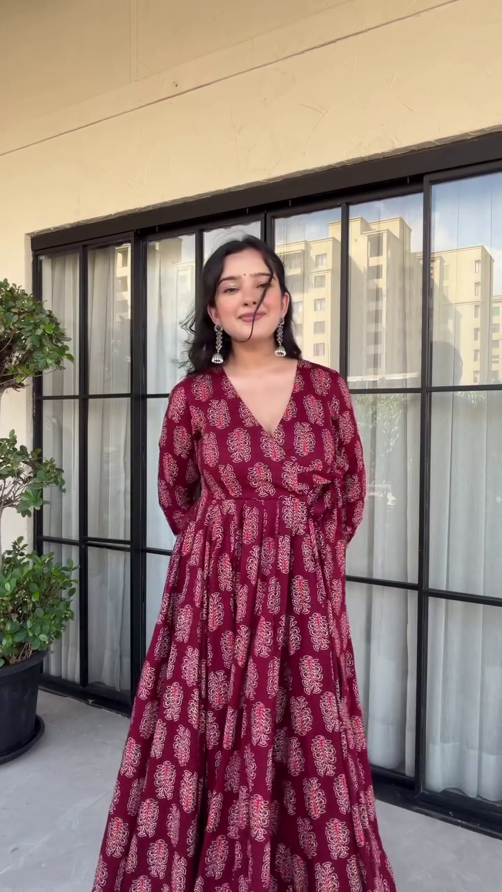 ✨ Elegant Maroon Angrakha Kurti Set – Premium Printed Cotton | Sizes XS-XXL ✨