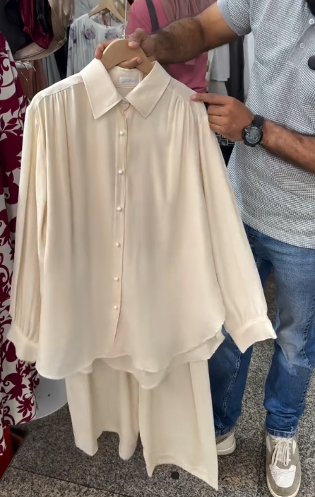 Be the first to review “✨ Luxe & Chic: Cream Satin-Effect Shirt with Rhinestone Buttons Paired with Trousers ✨”
