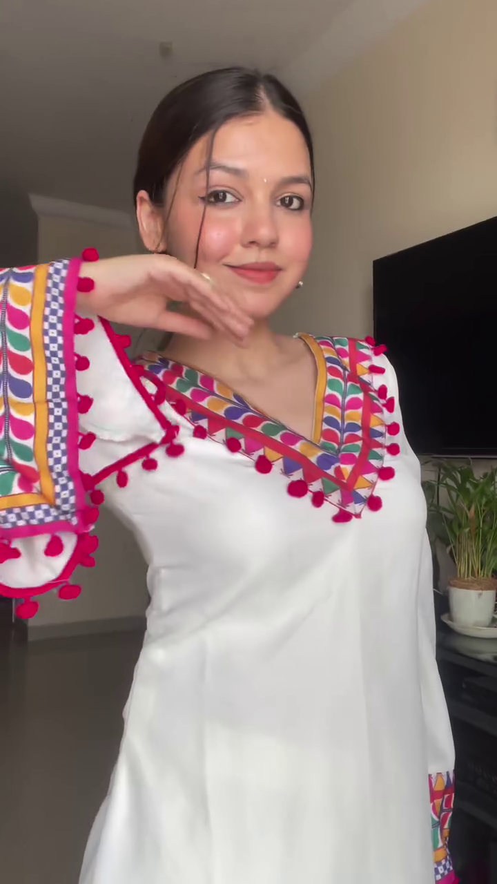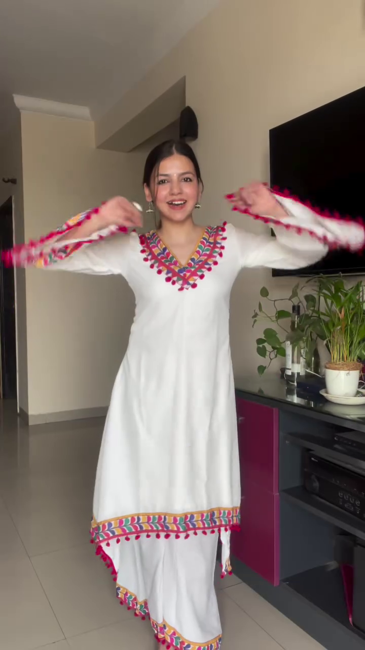 This outfit beautifully balances simplicity and vibrancy, making it a must-have for women who love colorful festive charm in everyday wear. The pom-pom detailing and bright trims add fun to the elegance of white β making it unique, stylish, and budget-friendly β¨.