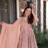 Crafted from soft, breathable fabric with a luxurious finish, this Anarkali drapes beautifully and feels comfortable for long wear. The blush pink base is adorned with intricate multicolor thread embroidery and motifs, adding a touch of sophistication 🌺. The matching dupatta with golden lace border enhances its elegance, making it a complete ethnic ensemble.