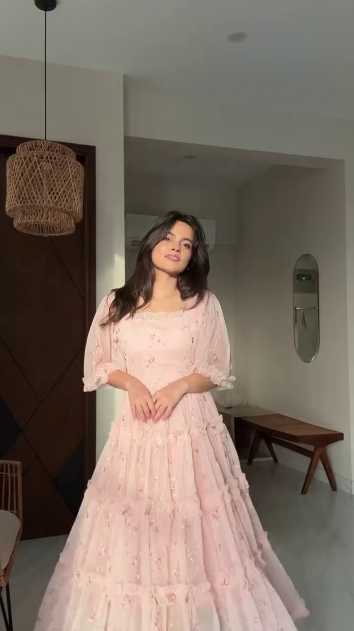 Crafted in a soft pastel tone, the gown features delicate floral embroidery scattered gracefully across the fabric, adding a subtle shimmer and handcrafted appeal ๐ŸŒทโœจ The intricate detailing enhances the overall look without overpowering it, making this piece refined, feminine, and picture-perfect.
