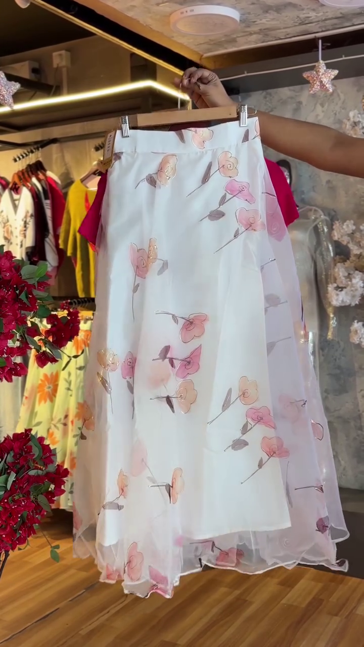 The highlight of this outfit is the dreamy high-waisted floral organza skirt 🌷 Made with a soft inner lining and a sheer printed overlay, it flows effortlessly with every step. The delicate pastel floral prints add a romantic, feminine vibe, while the flared cut enhances movement and creates a flattering, twirl-worthy silhouette.