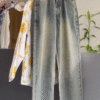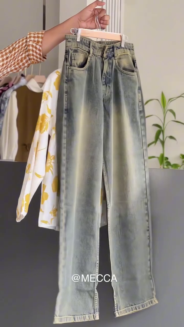 Pairing it is our vintage-style faded denim, designed for a flattering high-waist fit that elongates your legs and ensures all-day comfort. ๐ The mild washed texture and soft stretch fabric offer that perfect blend of durability and flexibility. Whether you tuck in the top for a sleek look or keep it flowing for an effortless chic vibe, this outfit strikes the right balance between modern minimalism and timeless charm.