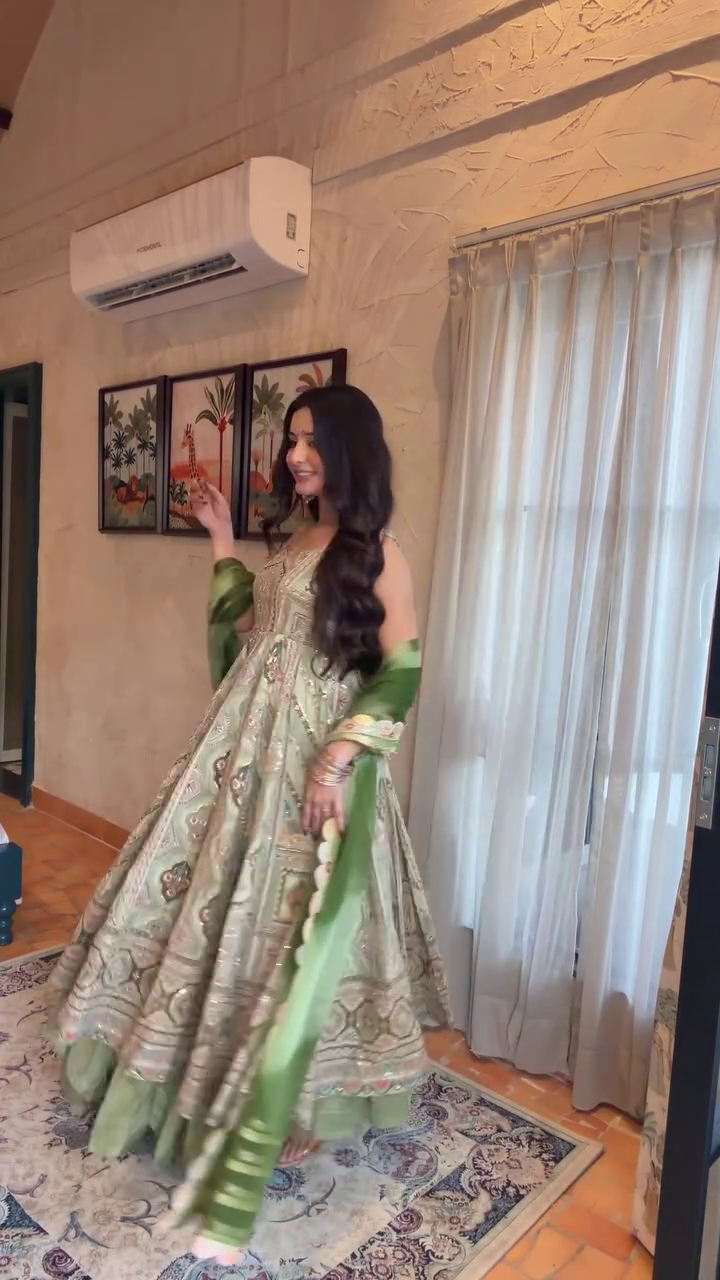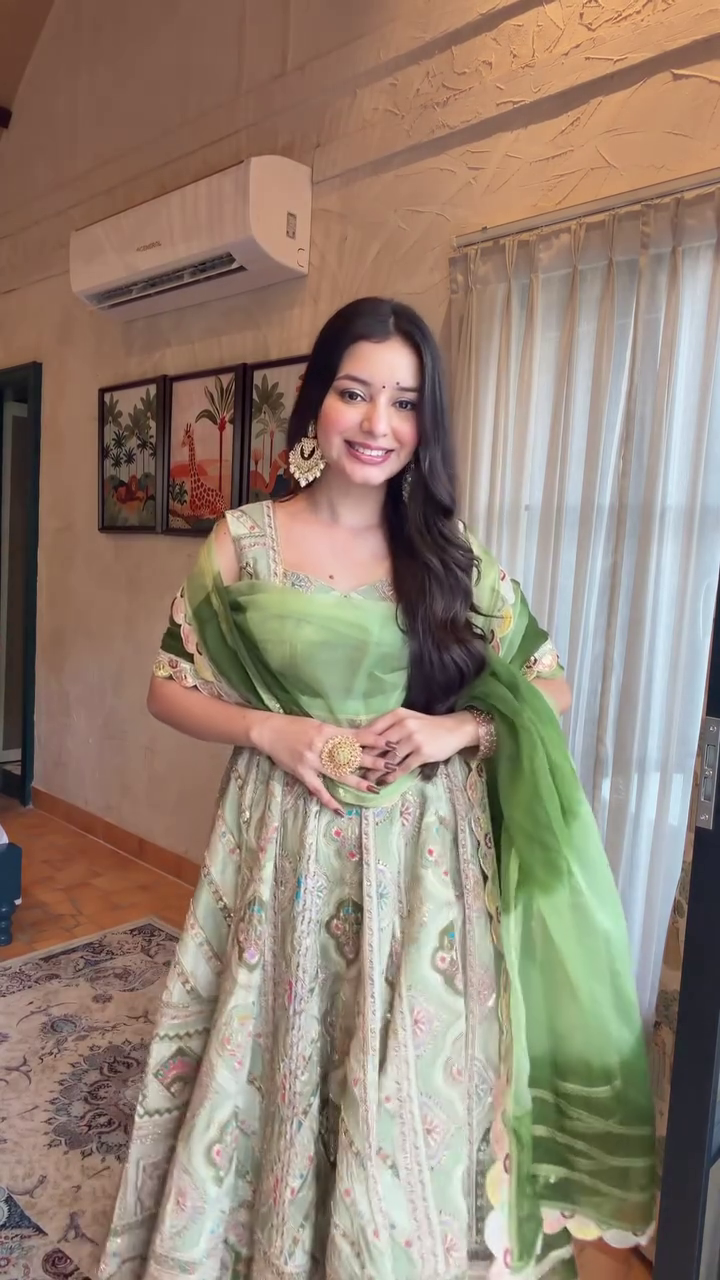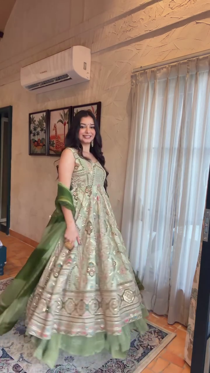 The dress in the image features rich thread work, zari detailing, sequin accents and a luxurious flared silhouette that instantly creates a grand festive look. 🌟
