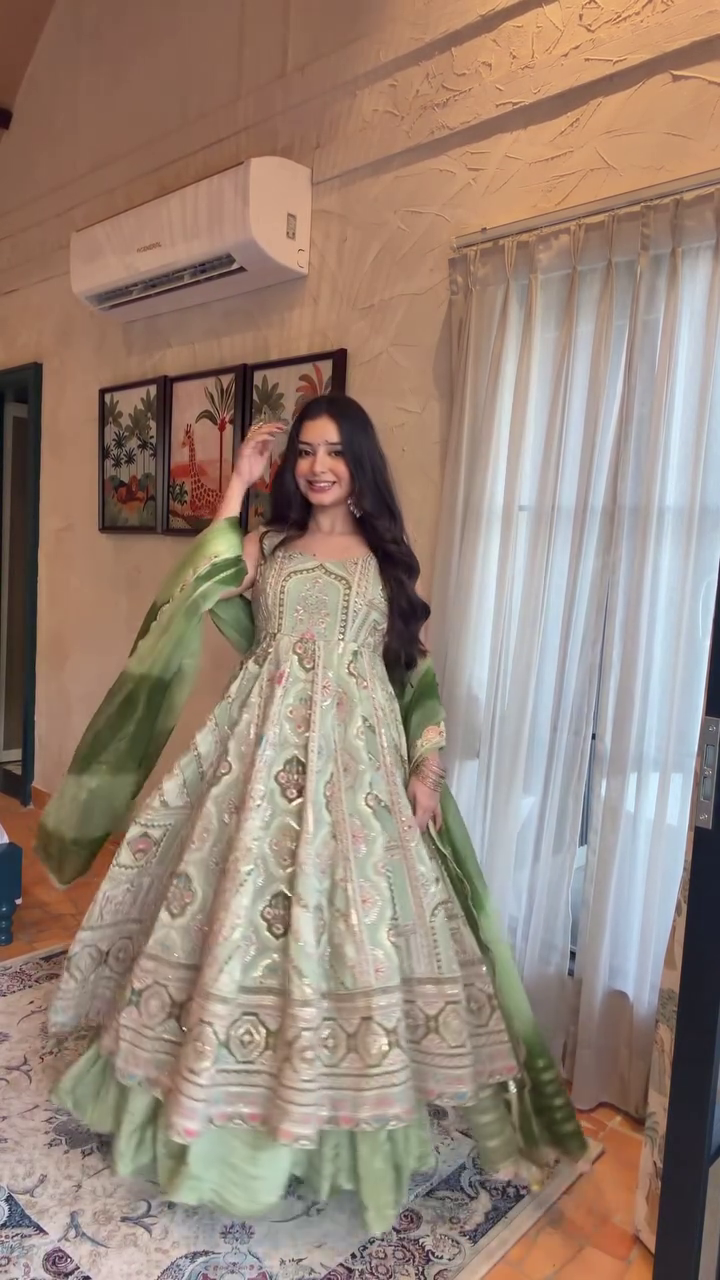 Bring home the charm of royal fashion with this Mint Green Heavy Embroidered Anarkali Set — a stunning outfit designed to make you shine at every function. ✨