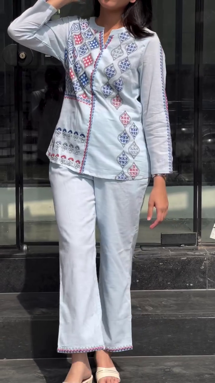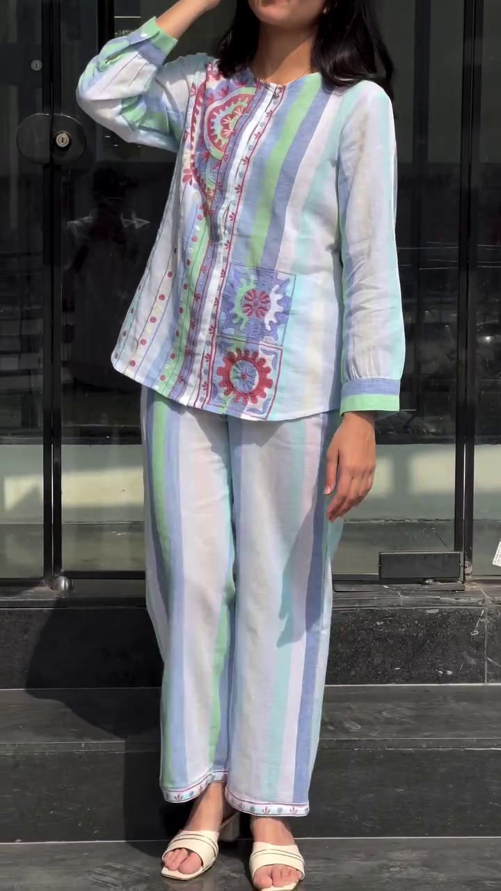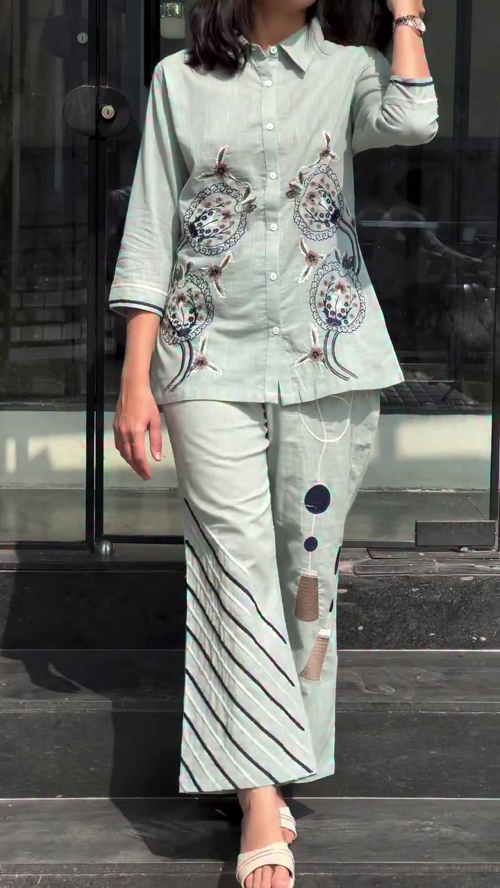 Crafted from premium breathable fabric, this two-piece set offers a lightweight and comfortable feel while maintaining a structured, polished silhouette. The button-down shirt-style top features delicate embroidery inspired by artistic motifs, beautifully placed to enhance the overall design 💫 The soft mint tone adds freshness and versatility, making it ideal for daytime outings, office wear, lunch dates, and semi-formal gatherings.