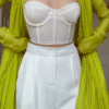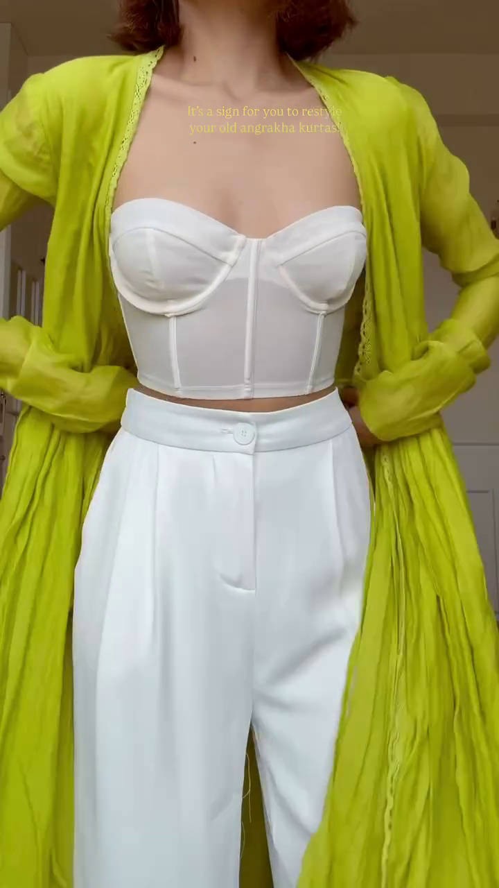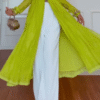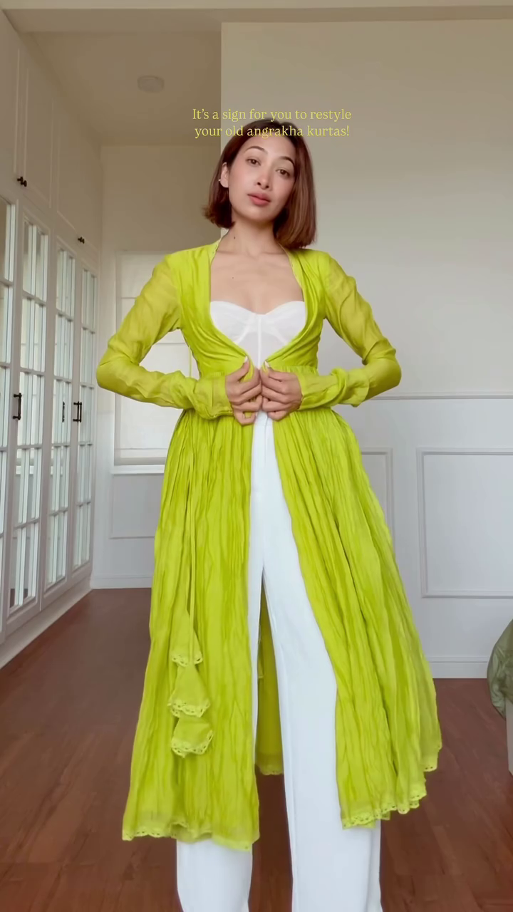 Crafted in lightweight breathable fabric, the lime green angrakha jacket features a flowy, pleated silhouette with tie-up detailing at the waist for a flattering fit. Itβs styled over white flared palazzos and a trendy bustier blouse, striking the perfect balance of fusion fashion.