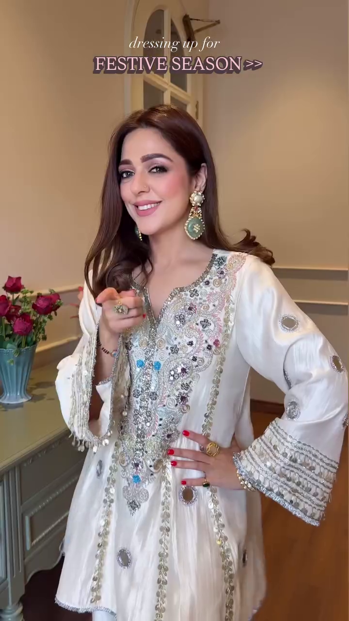 Celebrate this festive season in style with this stunning ivory embellished kurta and palazzo set β¨. A perfect balance of grace, tradition, and modernity, this outfit is designed to make you stand out at every gathering.