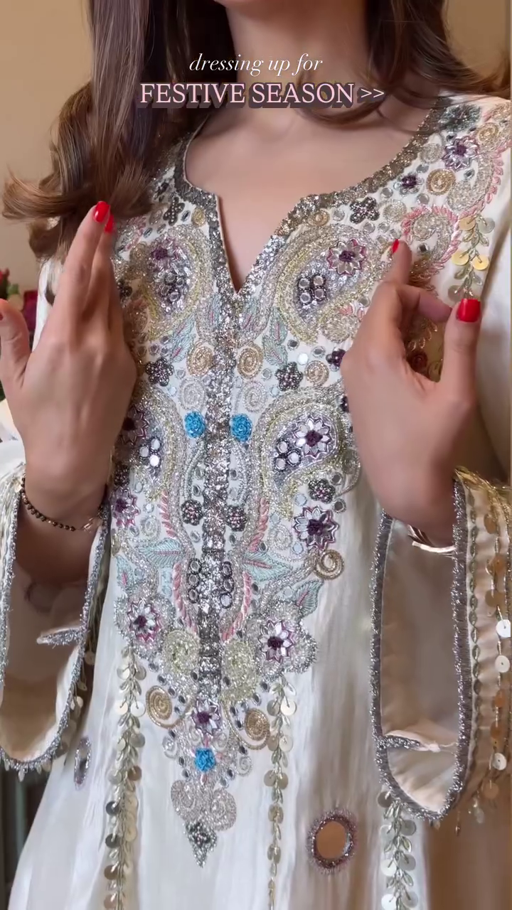 Crafted from premium, flowy fabric, this outfit drapes beautifully, adding effortless charm. The ivory base is enhanced with delicate embroidery, mirror work, and bead embellishments that sparkle under the light, giving you a radiant festive glow π. The kurta features a V-neckline with intricate detailing and statement sleeves with embroidered cuffs, paired with wide palazzo pants for a contemporary yet traditional touch.