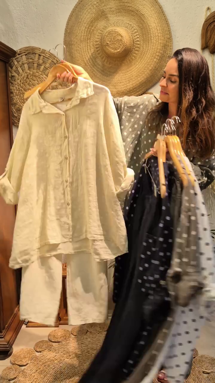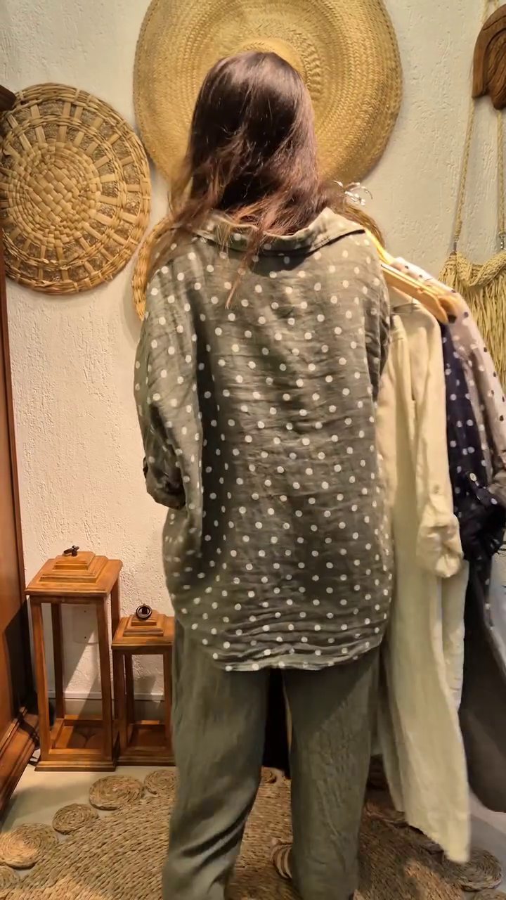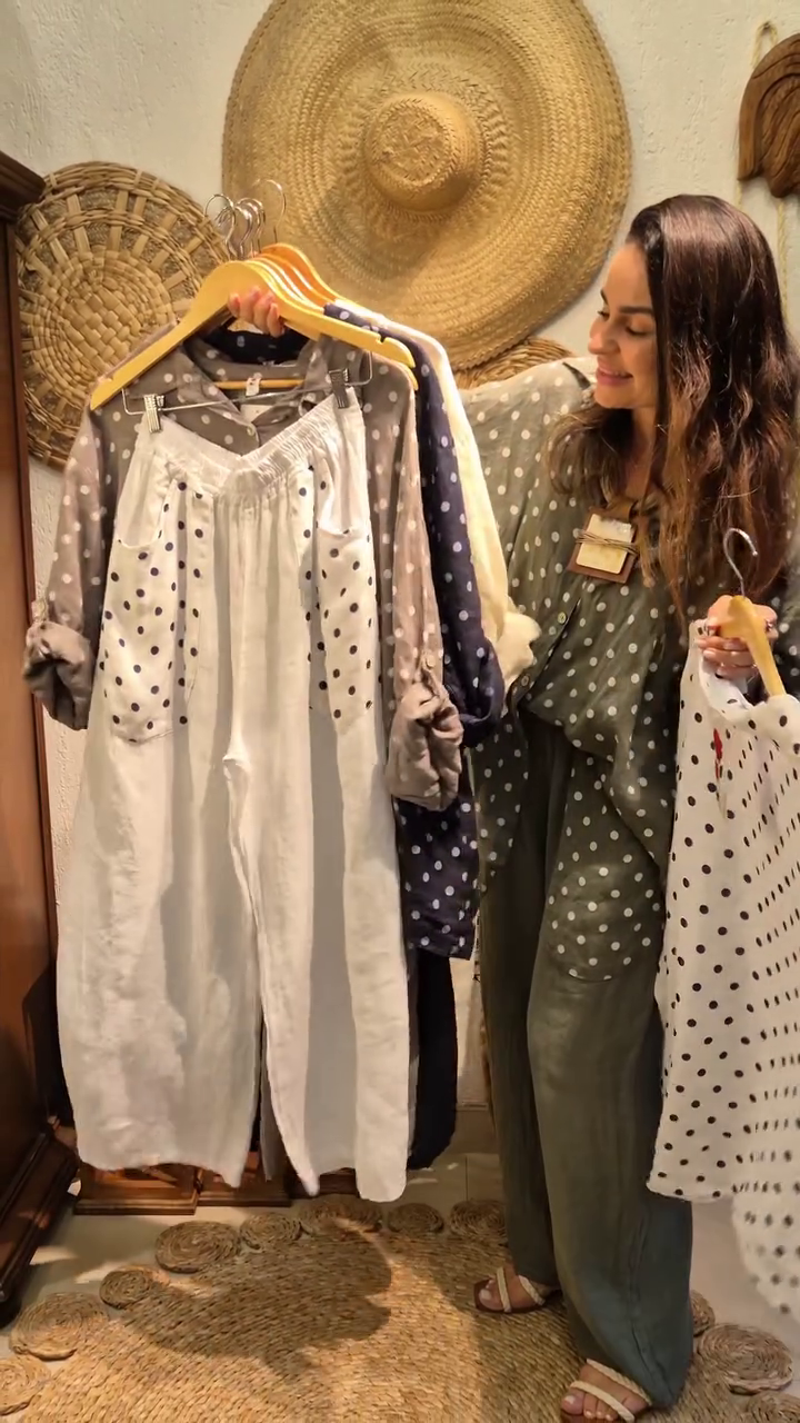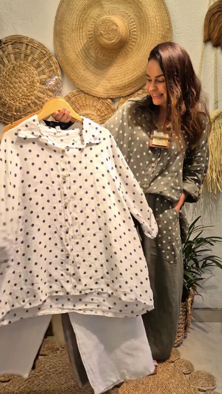 Crafted from premium breathable linen fabric, this co-ord set keeps you cool and comfortable all day long 🌿 The button-down shirt features a relaxed fit with soft rolled sleeves and a flattering drape that suits every body type. The charming polka dot print adds a fun yet sophisticated touch, making it ideal for casual outings, brunch dates, travel wear, or relaxed office looks.