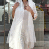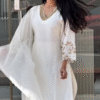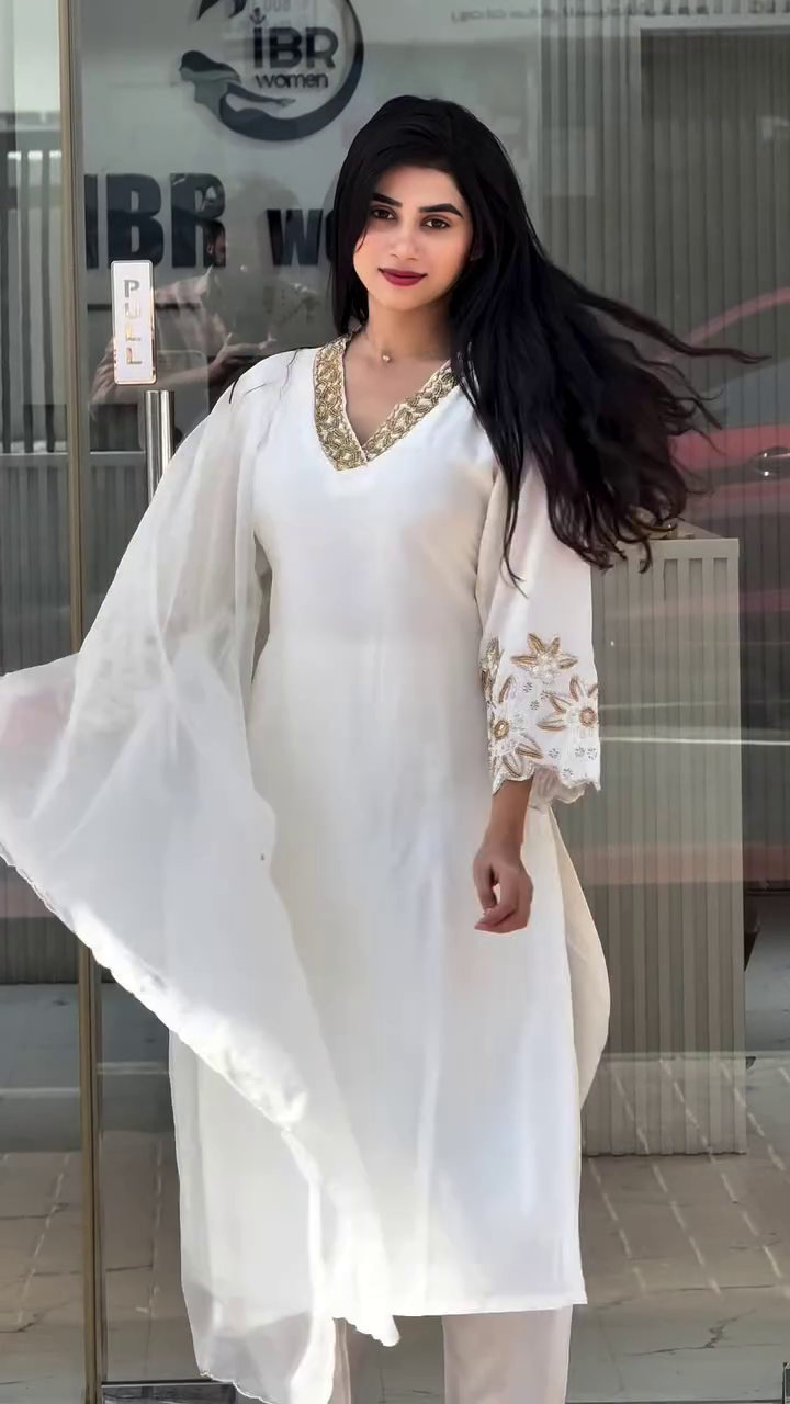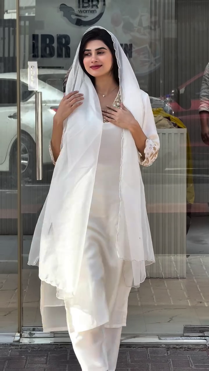 The sleeves are gracefully finished with embroidered cuffs, adding a subtle statement element while maintaining a clean, sophisticated aesthetic 🤍 The lightweight sheer dupatta completes the ensemble, flowing effortlessly and enhancing the overall look with soft movement and feminine charm 🌬️