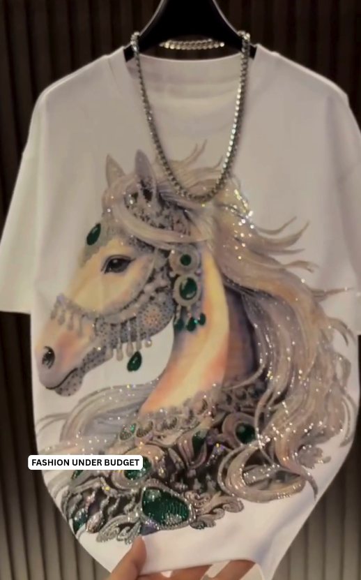 The graphic print of the horse is the standout feature π΄β¨. Designed with fine details and artistic flair, the horse motif adds a sense of movement and elegance to the t-shirt. The rhinestones and emerald-colored gems embedded in the print elevate the casual t-shirt to a fashion-forward piece, reflecting light and creating a sparkling effect that catches attention without being overpowering π. These embellishments provide a touch of luxury, transforming a simple cotton t-shirt into a statement garment.