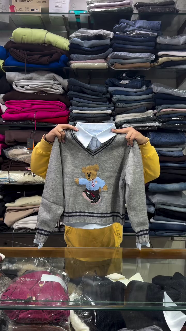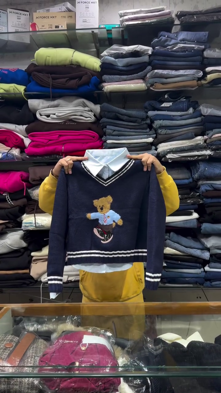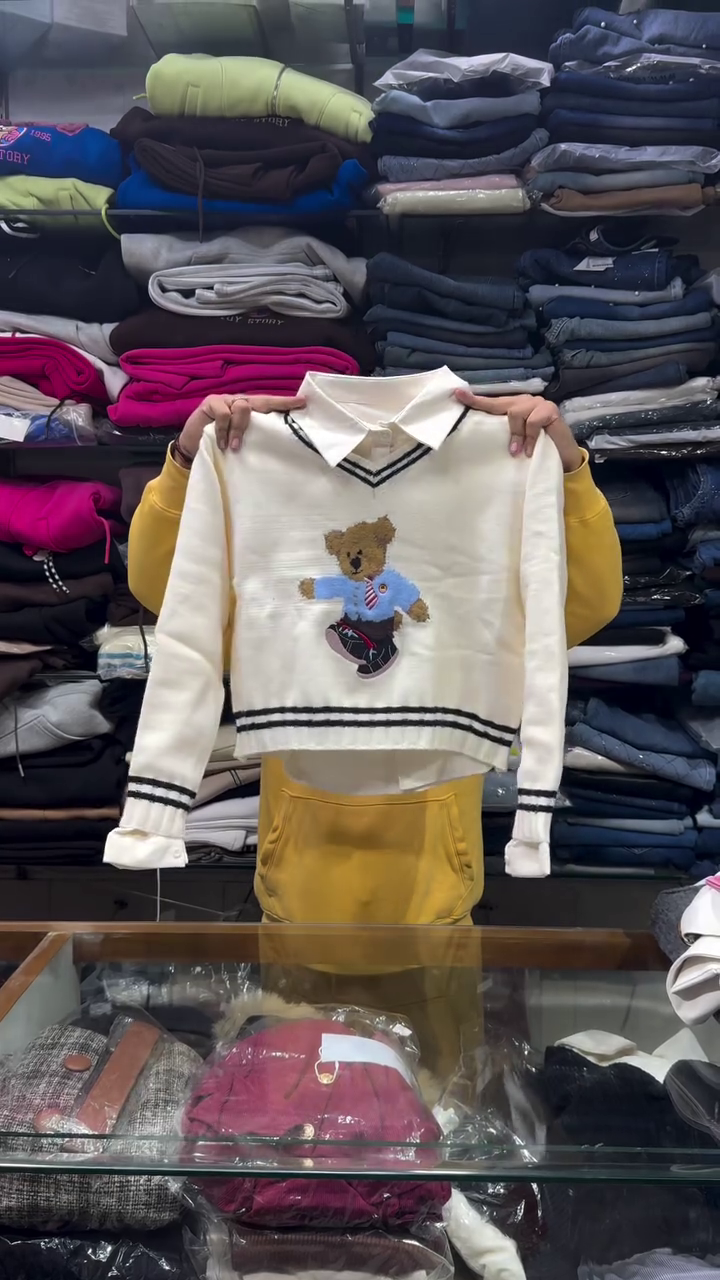The sweater comes in a beautiful cream/ivory white shade π€ which looks super classy and matches easily with any outfit. The highlight of the design is the cute embroidered teddy bear graphic π§Έ wearing a stylish blue shirt and tie β giving it a rich luxury vibe like imported fashion π₯. This makes it a perfect outfit for winter outings, school, parties or casual wear.