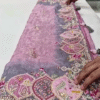 The standout feature is the delicate sequin embroidery work, thoughtfully placed throughout the saree to give it a subtle sparkle. The sequins catch the light beautifully, offering just the right amount of shine without being too loud. The floral and abstract embroidery motifs enhance the organza’s translucent beauty, making the saree feel both rich and refined.