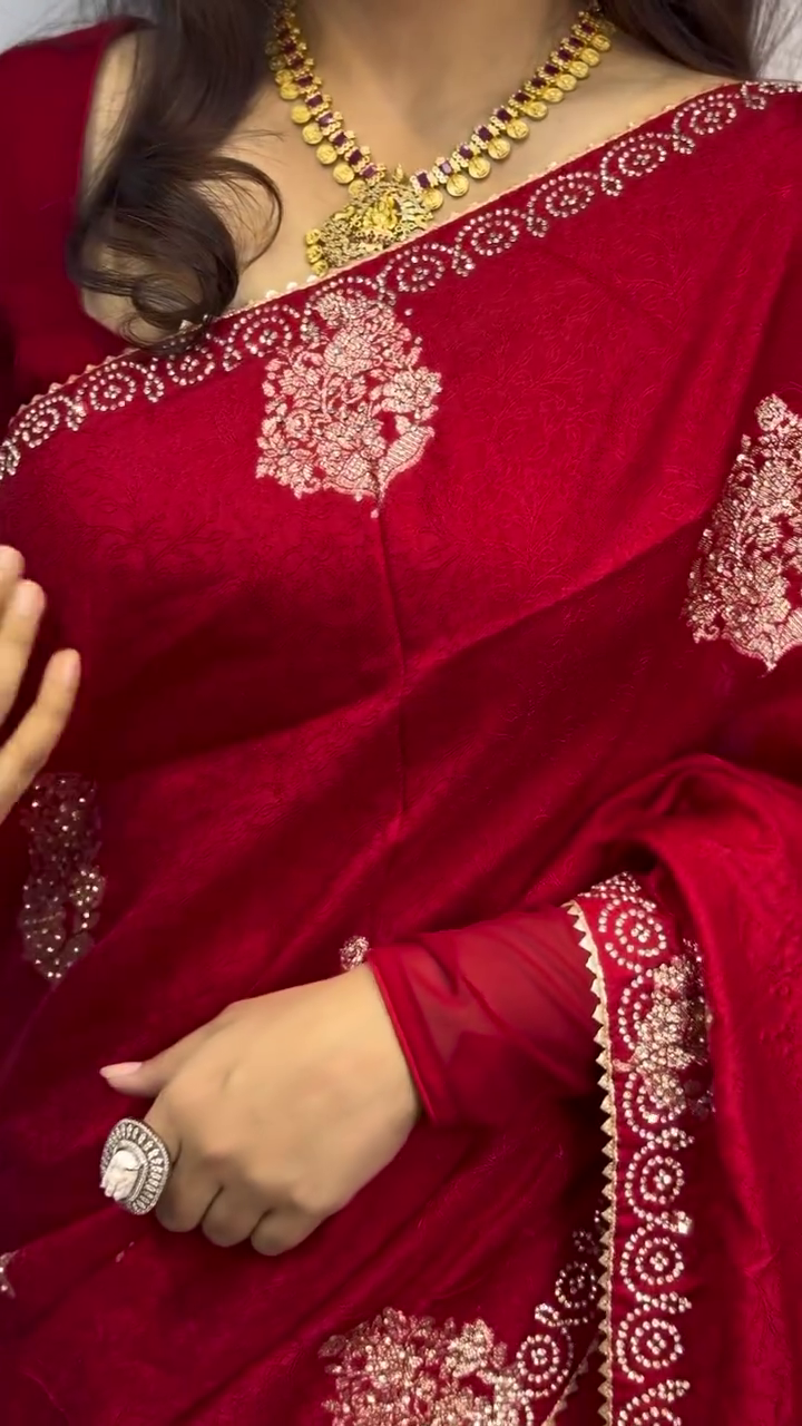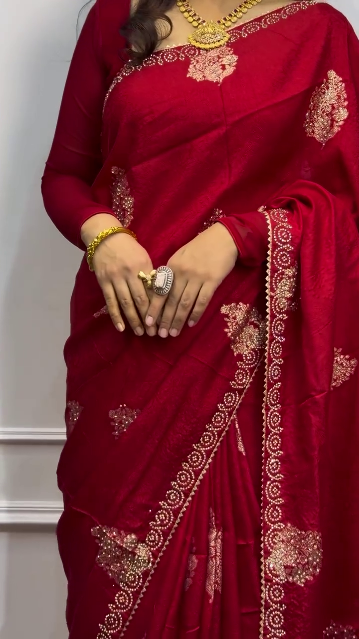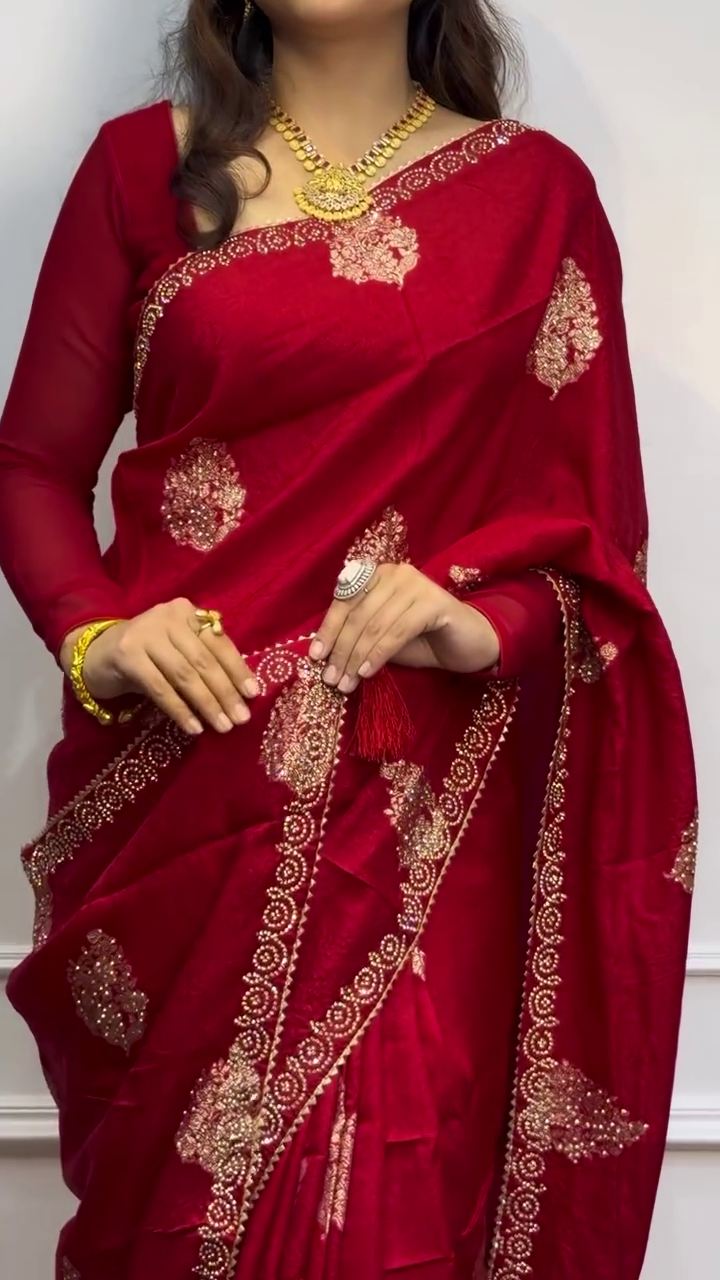 - Jewelry: Pair with traditional gold jewelry, Kundan, or Polki sets to complement the rich look of the saree.