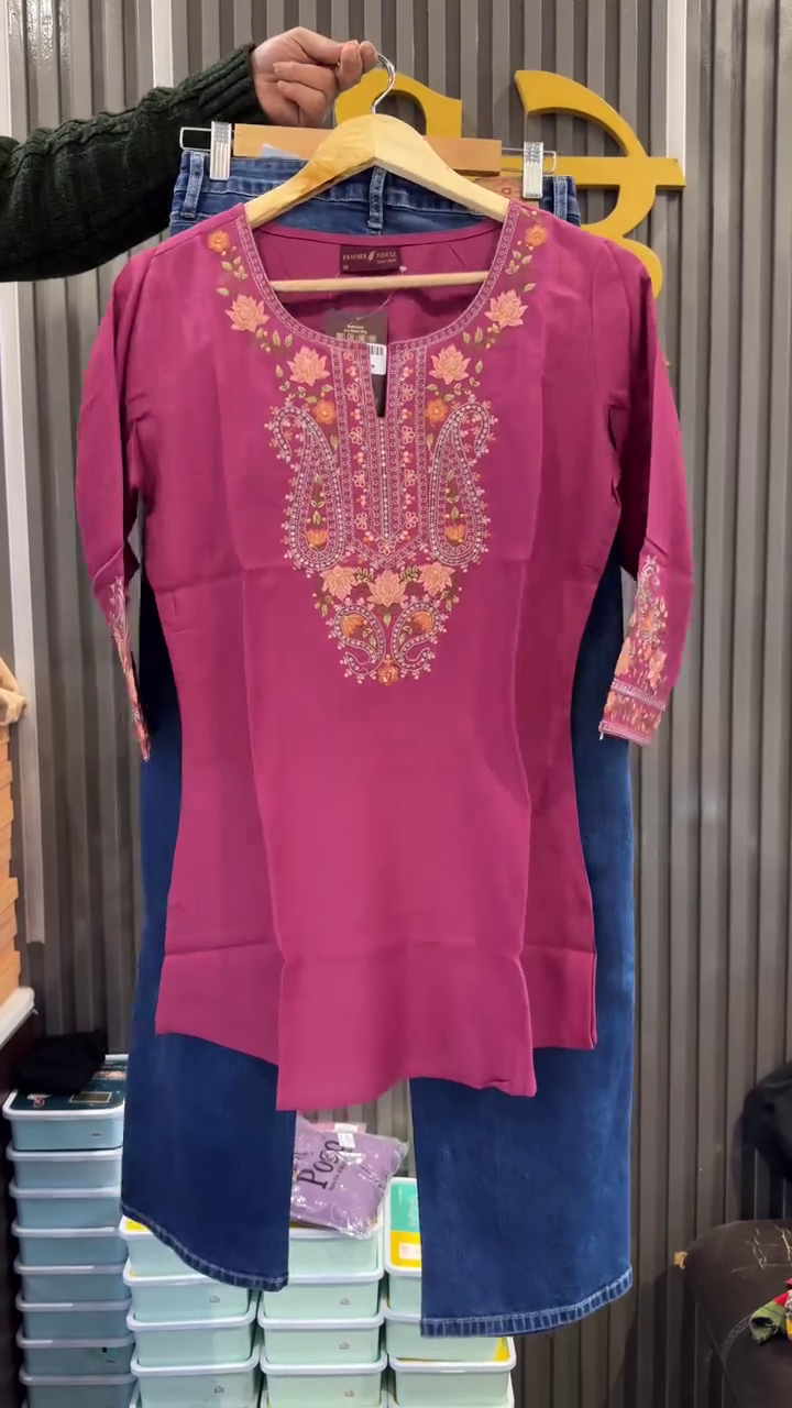 Step into timeless elegance with this Handmade Pure Lucknowi Short Kurti in a rich dark pink hue, beautifully infused with intricate Kashmiri embroidery. Crafted with care and tradition, this kurti is a perfect blend of two iconic Indian craftsmanship styles—Lucknowi chikankari and Kashmiri threadwork, making it a truly unique wardrobe piece.
