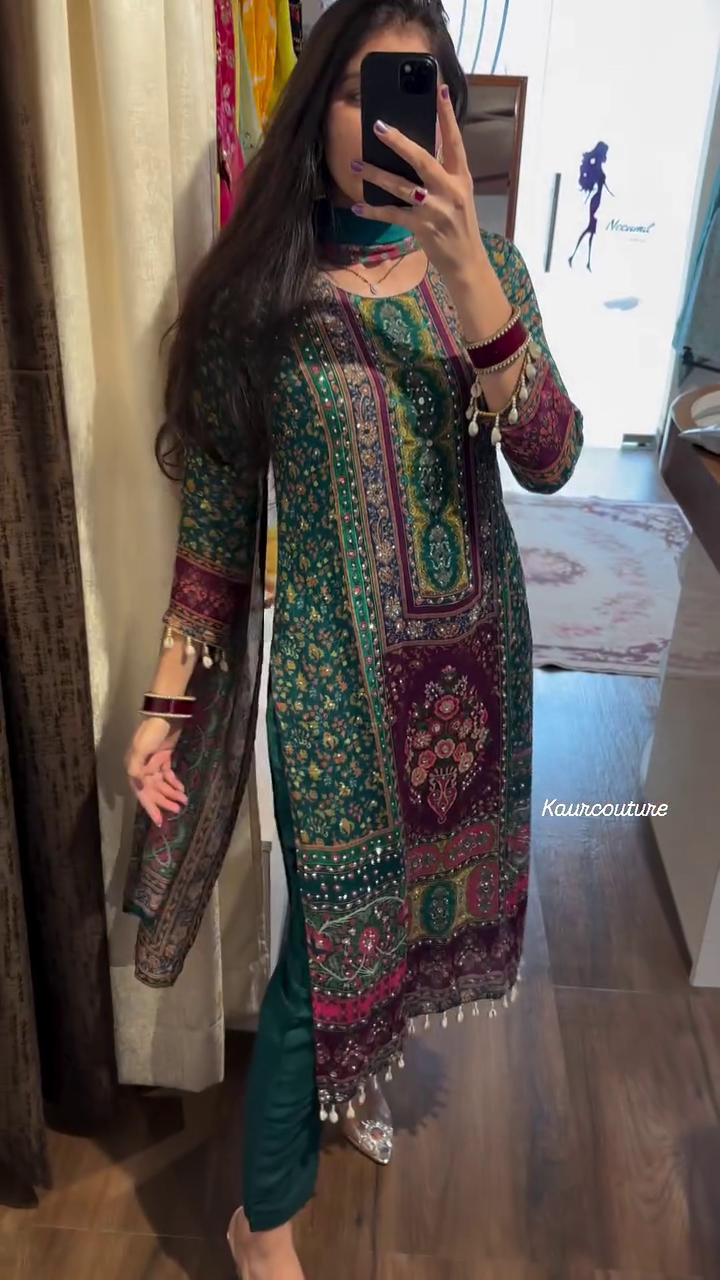 This heavy chinon printed suit set is ideal for a wide range of occasions. Its rich fabric, stunning mirror and Kodi work, and traditional motifs make it perfect for weddings, festivals, and special celebrations like Diwali, Eid, or family gatherings. The outfit can be styled with statement jewelry such as jhumkas (traditional earrings), bangles, a maang tikka (headpiece), and a heavy necklace, adding to the grandeur of the ensemble.