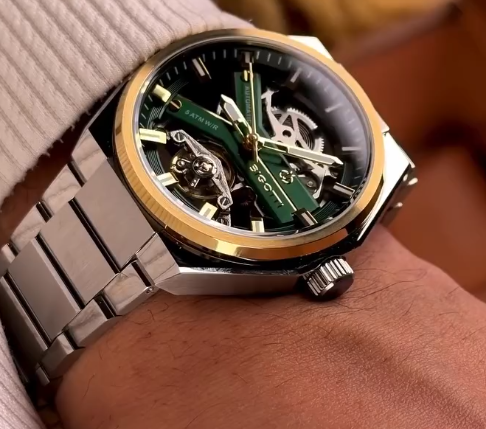 Luxury Green Skeleton Automatic Watch – Gold Bezel Stainless Steel Men’s Wrist Watch (Premium Open-Heart Edition) πŸ’šβŒšβœ¨
