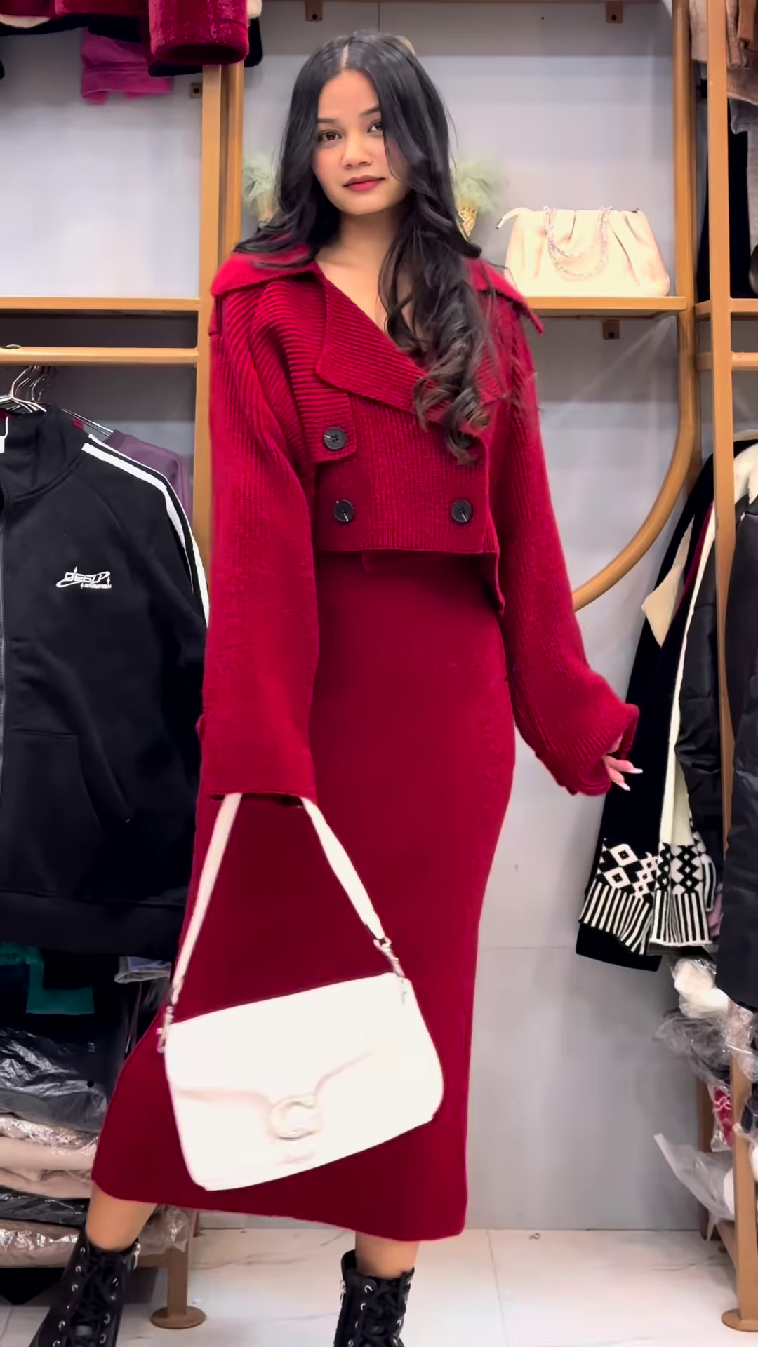 A **knitted red cardigan and tube dress set** is a perfect cozy yet chic choice for the cooler season. Here’s how you can style and enhance this trendy look: