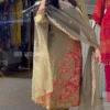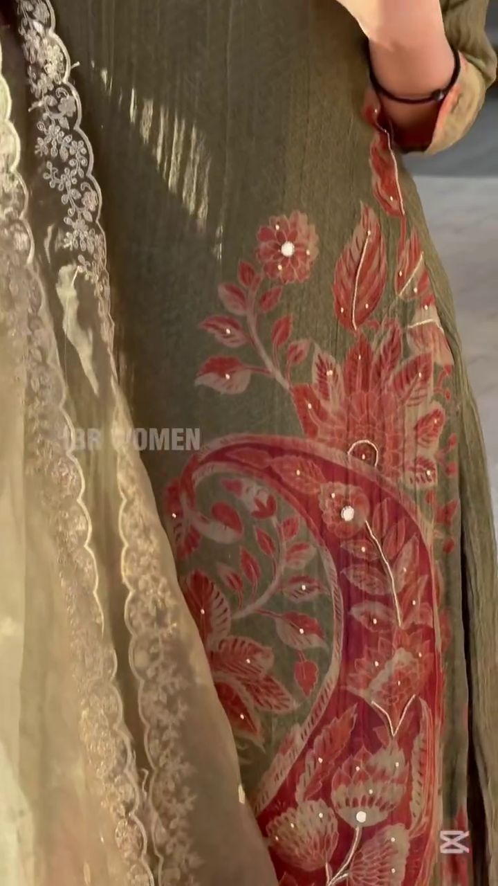1. **Kurta Fabric**: Made from printed crape, this fabric is lightweight, flowy, and breathable, making it a comfortable choice for long hours of wear. The embroidery detailing adds depth and texture to the kurta, making it a standout piece.