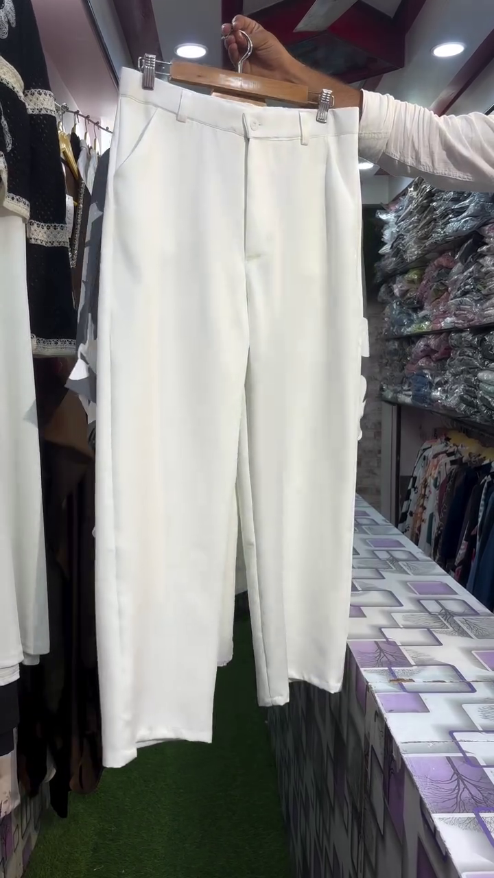 Paired with the tunic are matching white trousers designed to complement the flowing top. The tailored straight-leg design provides balance and structure to the overall outfit, creating a cohesive, stylish silhouette. The trousers’ soft, breathable fabric ensures all-day comfort while maintaining a sleek, elegant appearance. Together, the top and trousers form a harmonious co-ord set that is easy to style for various occasions.