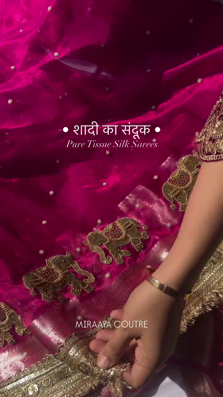 Step into the world of timeless elegance with this Pink Banarasi Tissue Silk Saree, a masterpiece adorned with intricate hand embroidery. Every stitch tells a story of craftsmanship, tradition, and luxury, making it the perfect pick for a bride’s treasure trove. The delicate detailing, shimmering fabric, and exquisite elephant embroidery make this saree a true heirloom piece—one to cherish for a lifetime. 💕