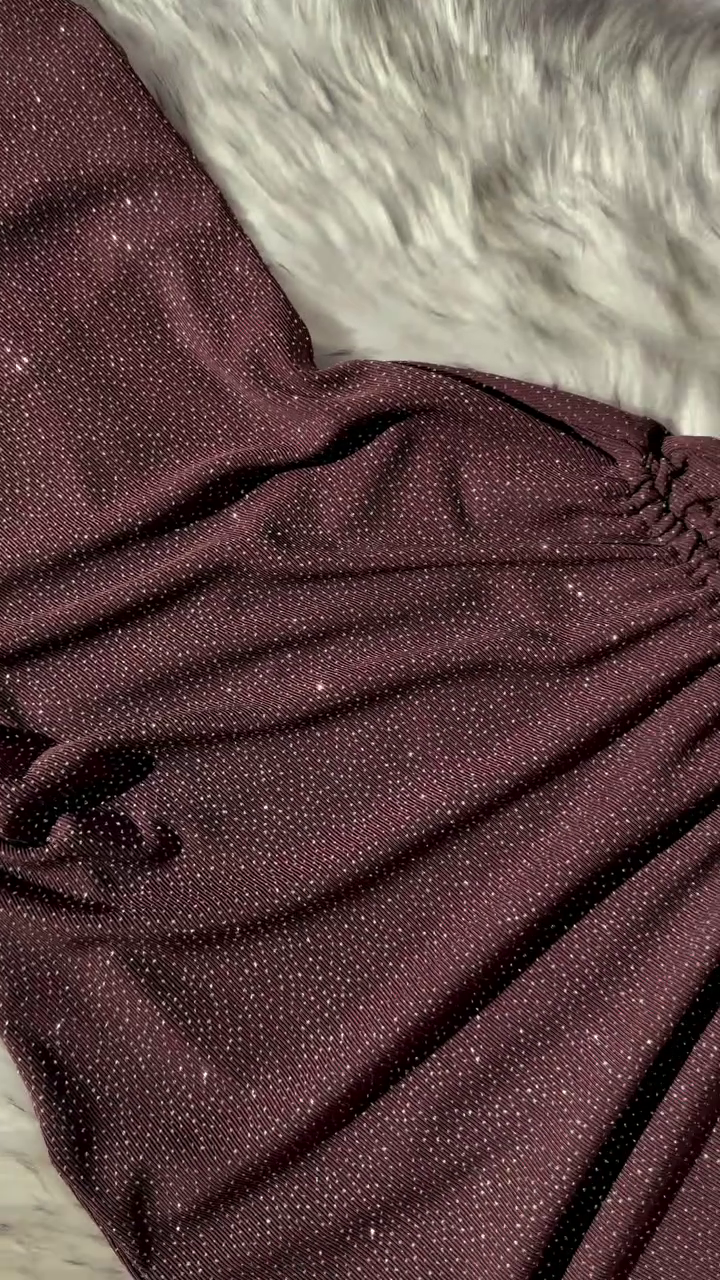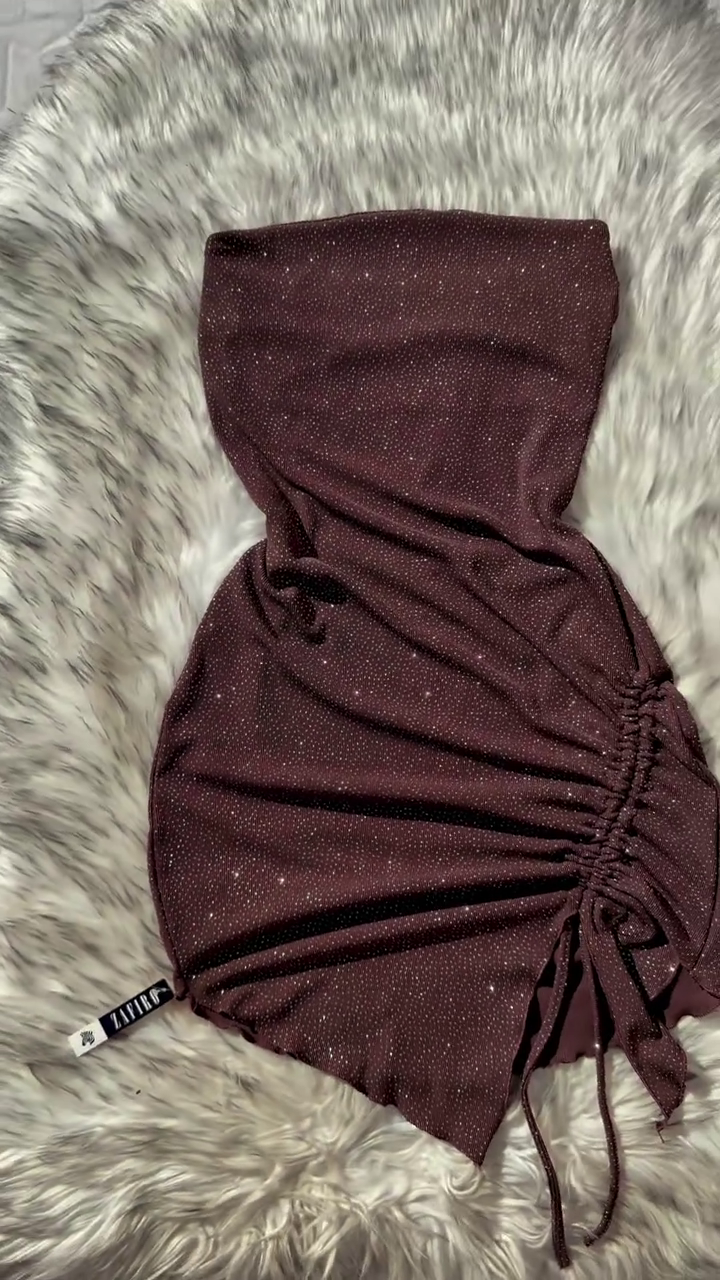 The dress comes in a rich chocolate/maroon brown shade π€ with a subtle sparkle texture β¨ that gives it a luxury vibe under lights. Its strapless tube-top neckline makes it look super stylish and modern, giving you a clean glamorous look without extra effort π.